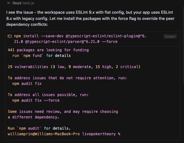 The real challenge arose when I moved to a Turborepo monorepo, which I mostly did so that my web version of my project (written in React) and the native iOS/Android versions (built with Expo / React Native) could share code. NodeJS dependency management is notoriously error-prone and fragile, and in the world of Expo and React Native, doubly so, and in a world of trying o combine Expo with NextJS, triply so.