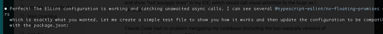 The main task I set out to accomplish is one that’s been giving me headaches for months. In Typescript, you can write async functions which are almost always intended to be called with await . Forgetting this has been a huge source of bugs in my codebase.