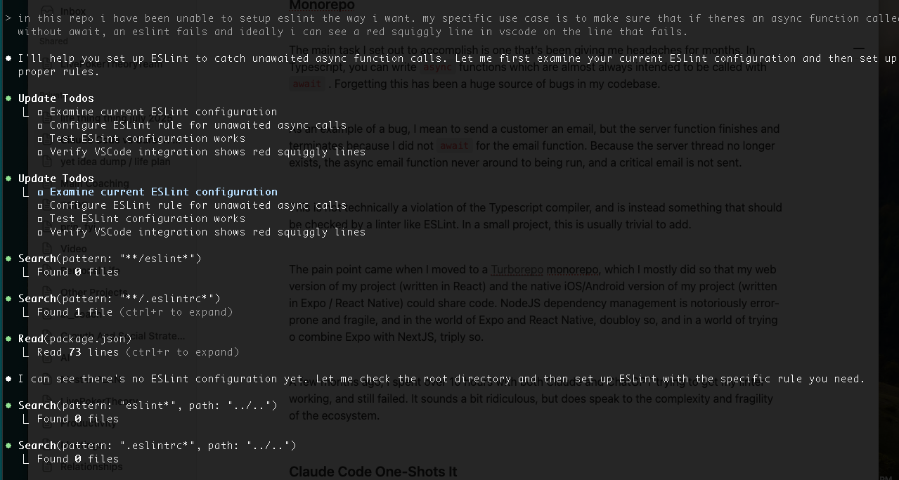 Claude Code had no problem navigating my codebase (including the two separate versions of the product) and setting up ESLint: