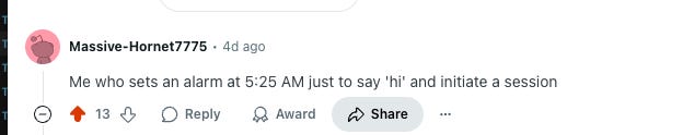 To work around the 5-hour reset limit, some developers on Reddit are even reporting waking up early to send Claude a quick message so that they get a fresh quota reset fairly early in their workday, meaning Anthropic has solved one of the hardest problems in software engineering - getting programmers out of bed before 8AM.