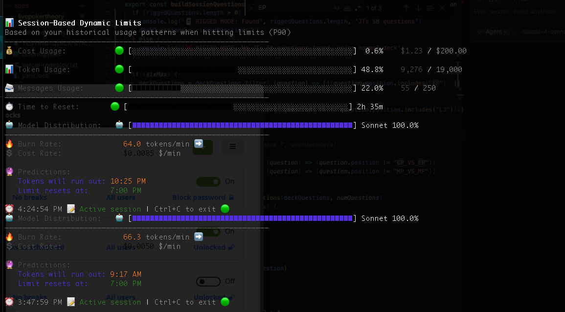 After you install it, you can run claude-monitor in a terminal window and it will show you the cost, token usage, and message limit of your current session, and the percentage you’ve moved toward your maximum quota. Keep in mind, Claude has quota on both token usage and the number of messages you send to Claude, so you should keep an eye on both. The cost is only your true cost if you’re using an API key. If you’re on a monthly subscription plan, then the cost is just what it would cost if you used the API key - which is quite helpful if you’re evaluating whether a monthly plan is cheaper than using the API key.